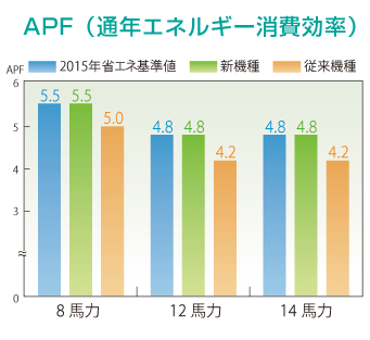 業界トップクラスの高APFを達成し全機種冷暖平均COP3.39を達成。既設機種からの更新により、CO2排出量の抑制と年間電気代の大幅な削減ができます。