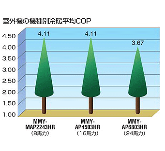 各能力ランクともに業界トップクラスのAPFを実現しています。高効率DCツインロータリーコンプレッサー+高速演算ベクトルインバーターなどの省エネ技術の採用でハイレベルAPF5.4、COP4.11を達成。(P224形)